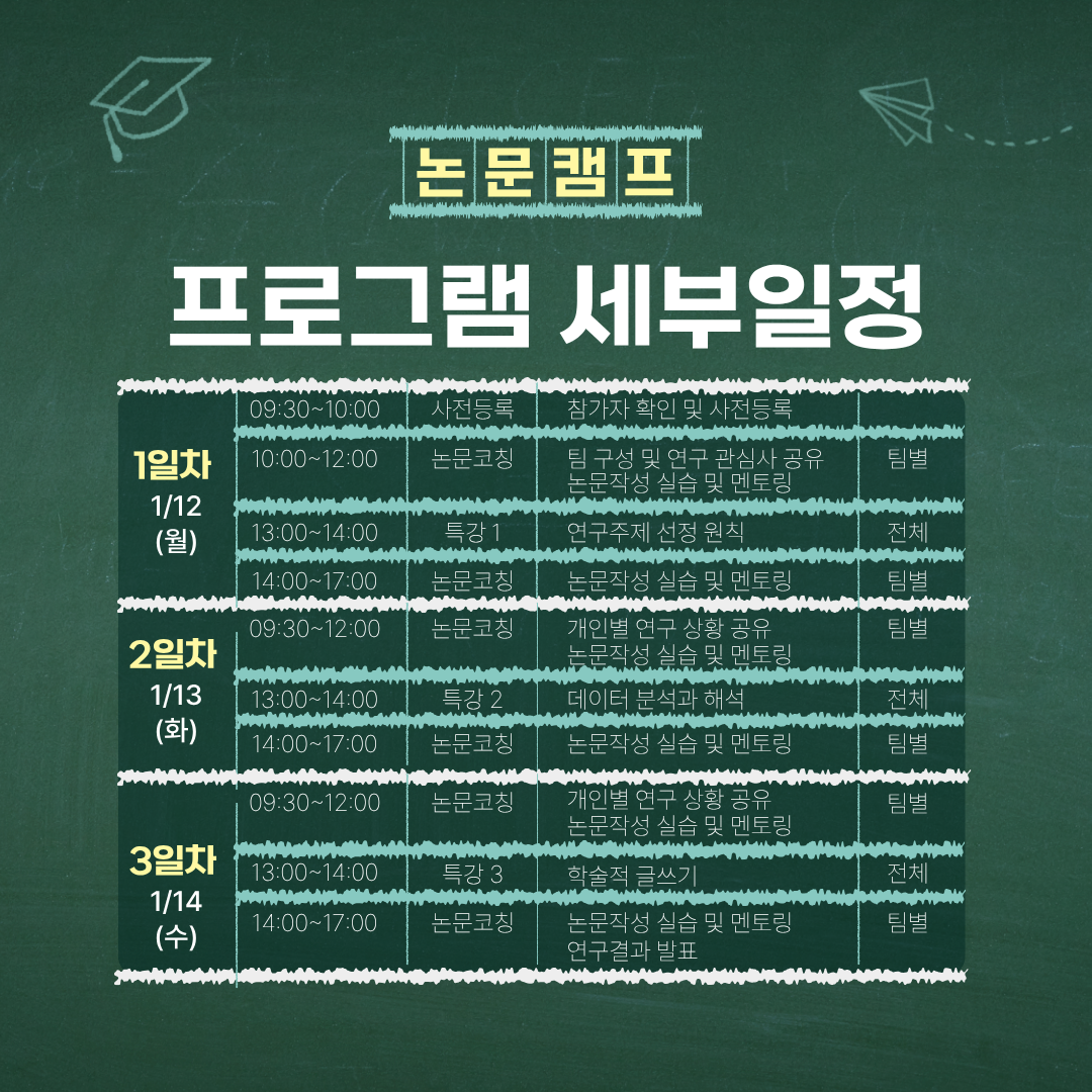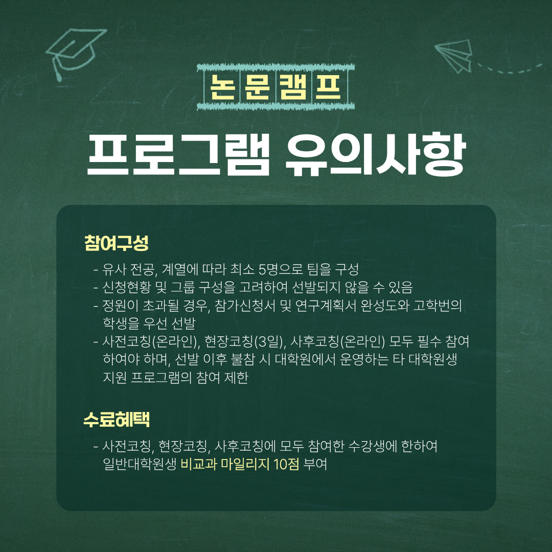 *논문캠프는 제한된 소수만을 선발하여 소그룹도제식으로 운영되기 때문에 참석 이후 불참시 대학원에 실시각 보고됩니다.