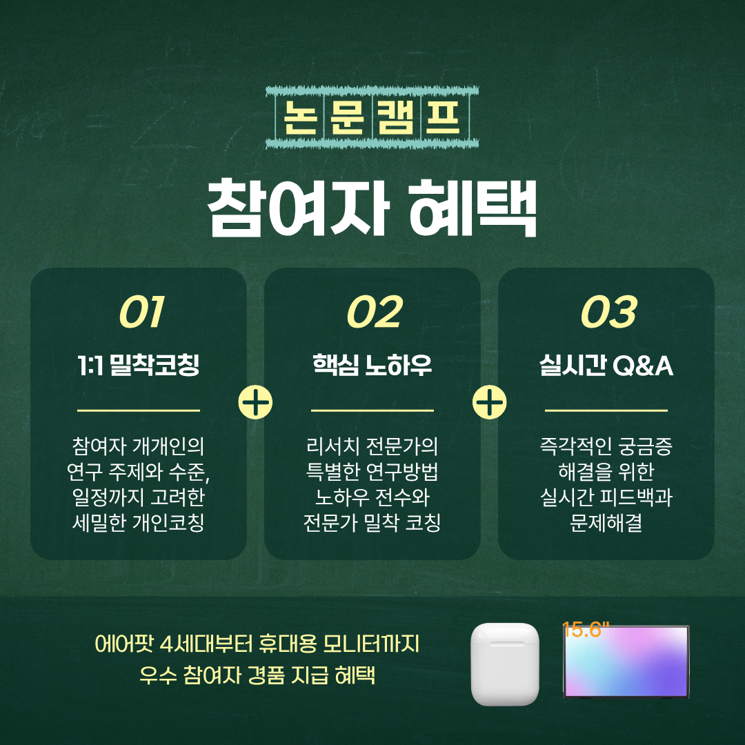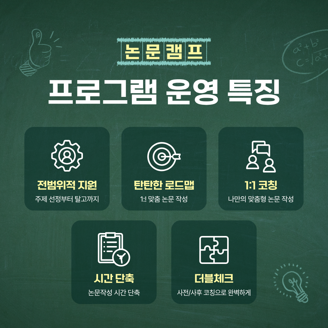 온·오프라인을 병행하여 호텔이나 리조트와 같이 격조 높은 연구 몰입 환경에서 연구 성과를 도출하는 프로그램이다. 분야별 전문 박사들이 수강생 개개인에 밀착하여 주제 선정부터 최종 탈고 과정에 있는 학생들까지 논문작성 원칙과 방법, 대안을 같이 고민하며 수강생들의 연구역량을 강화하는 것을 목적으로하는 선진국형 고등교육 프로그램이다. 논문캠프에서는 '집체교육'을 진행하기 보다 소그룹을 형성하여 리서치 전문가가 도제식으로 논문작성을 코칭하여 그 효과가 높다.